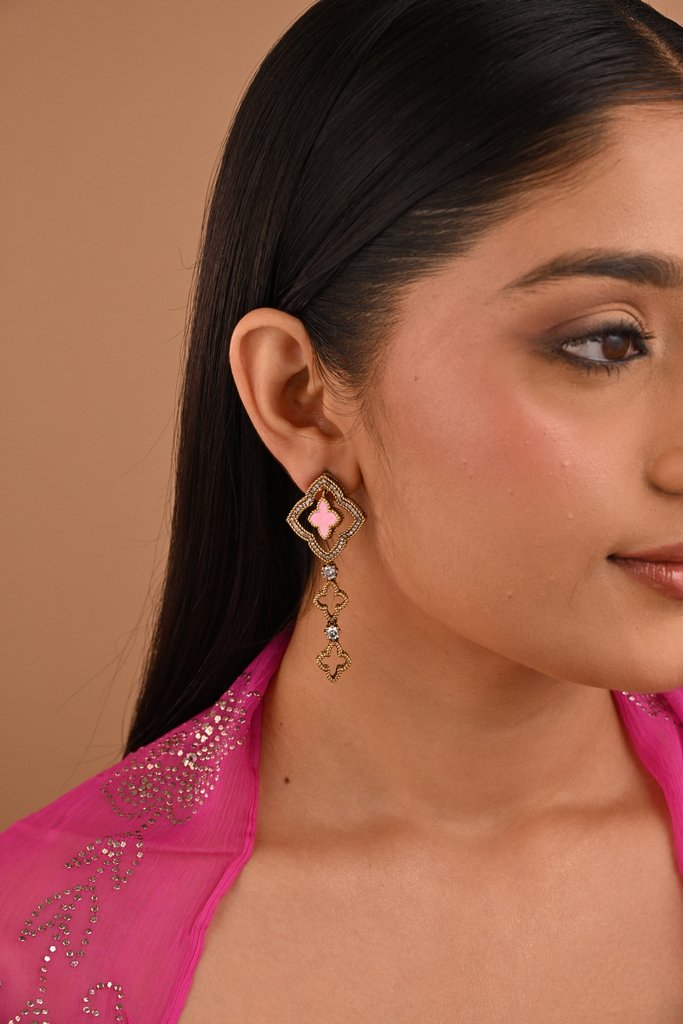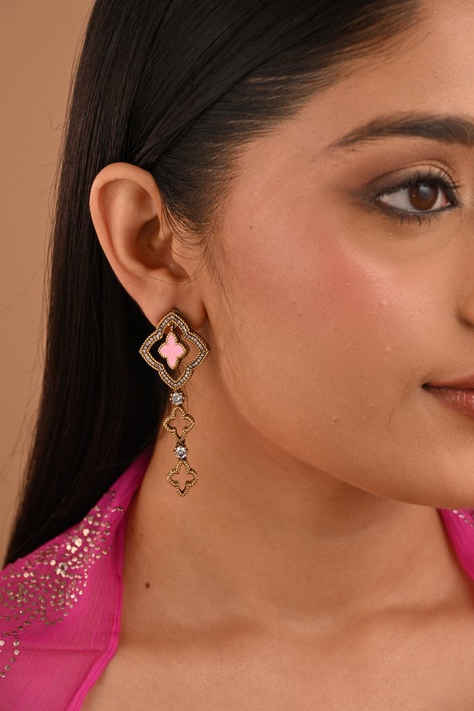The traditional Meenakari with Tiny crystals, intricately inlaid in our signature clover motifs with interesting hollow and solid details set these exquisite vintage earrings featuring Baby Pink coloured enamel coated clover motifs apart from anything you may have seen before.delicately hand crafted to perfection, these dangling earrings with capture movements in a perfect poetry.