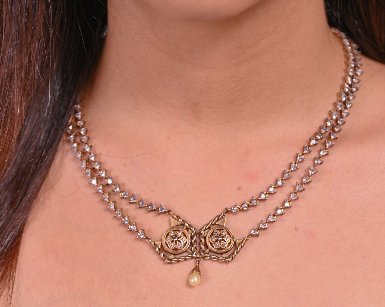 Tiny crystals and vintage elements come together in these layers of luxury, which combine a simple silhouette with intricate details. Featuring our statement triangular stones chain in 2 layers, this necklace is as much a show stopper as it is easy to carry.