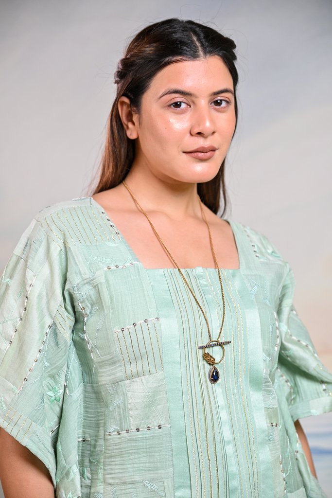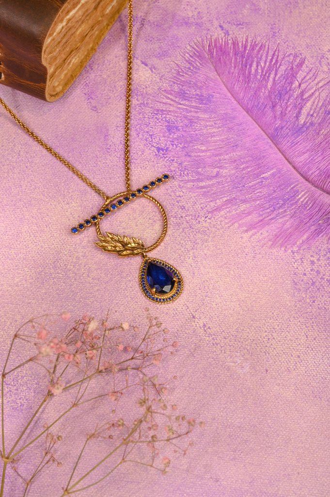 Featuring a large blue sapphire drop semi precious stone in AAA quality, this long chain necklace features a vintage hemi-wreath on twisted rope detailed circular mottif and a pseudo clasp with tiny blue stones.Hand crafted in silver alloy,brass alloy, this necklace is plated in 18kt gold in a rustic finish. It is non allergenic in nature