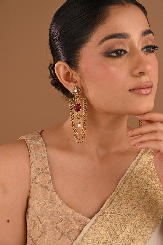 Adorned with ruby coloured semi-precious large sized AAA cut stones, these earrings are handmade