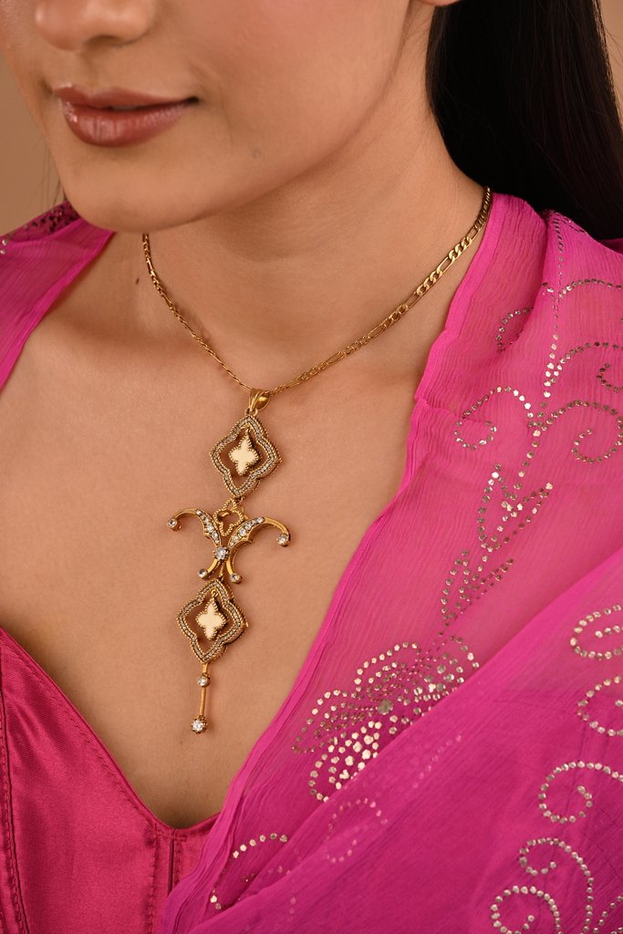 Set in vintage 18kt gold-plated Silver Alloy, Brass Alloy, this pendant exude timeless elegance and charm. The intricate detailing and luxurious materials makes it a standout accessory for any occasion. Whether you’re dressing up for a special event or adding a touch of vintage sophistication to your everyday look, it is the perfect choice.