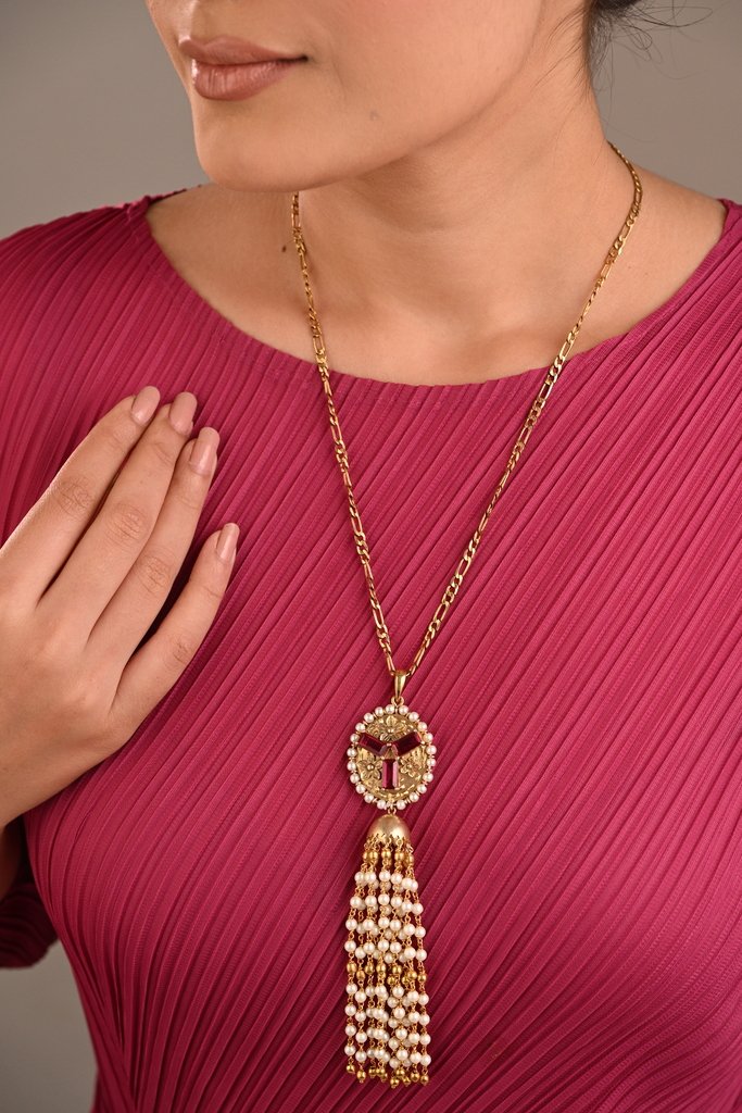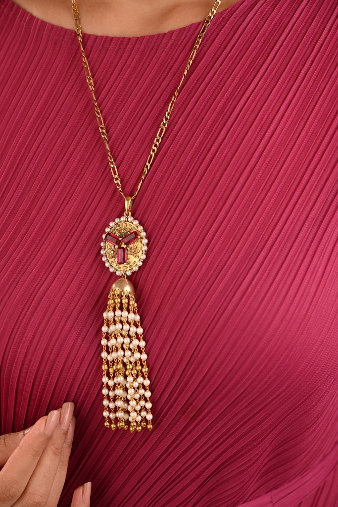 Rooted in old-world charm, this regal pendant features a ruby centre embraced by seed pearls and a golden frame, flowing into hand-strung jhumka style pearl tassels