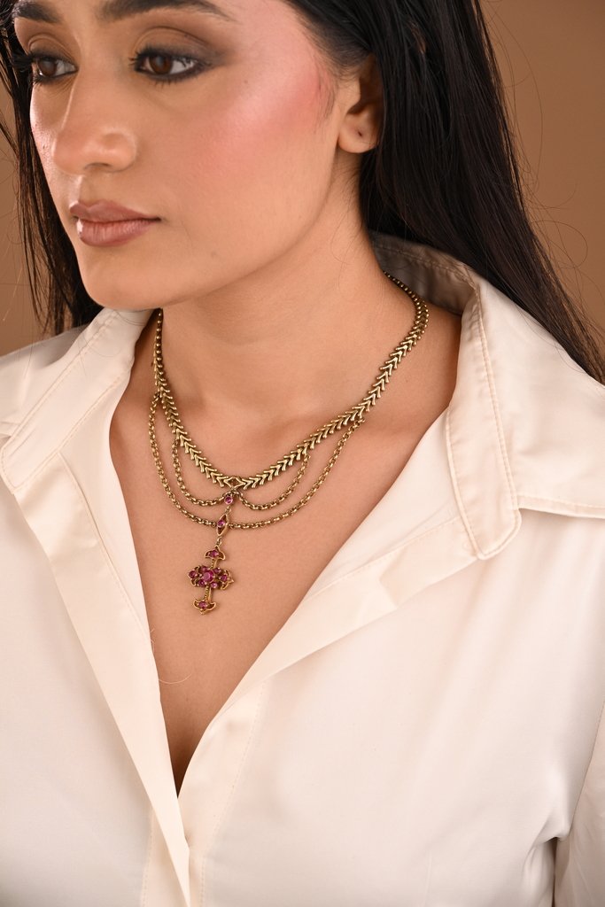 Vintage, quirky and very eye-catching, this necklace features our statement v chains and an eye catching cross. It is embellished with stunning ruby coloured AAA quality semi precious stones. It is