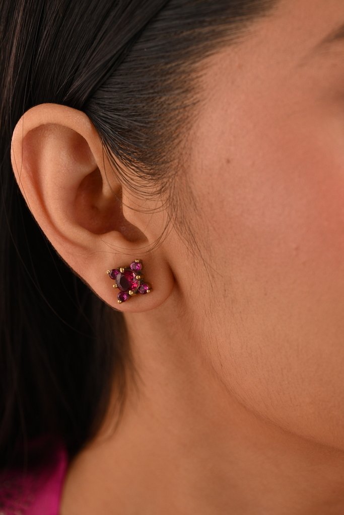 Another way to celebrate self-love, our Ruby Studs with intertwined vintage 18 kt gold plated Silver alloy and Brass alloy. Crafted in sterling ruby coloured stone hand crafted showcase unique flow and cuts.The central large semi precious stone is of AAA quality and is nestled between tiny complimentary crystals.
