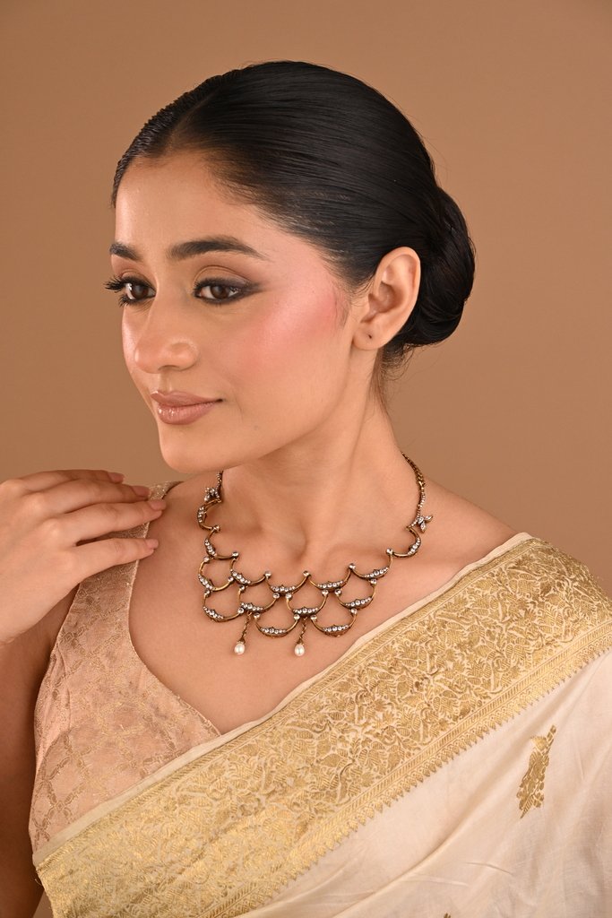 A harmonious, symmetrical cascade of layered crescent moons forms a flowing bib of light and movement. Crafted in 18kt antique-finish gold, shimmering with clear crystals like stardust. Tiny leaf motifs, bezel-set gems, and delicate pearl drops breathe life into the piece, wrapping it in softness, balance, and a touch of vintage warmth.